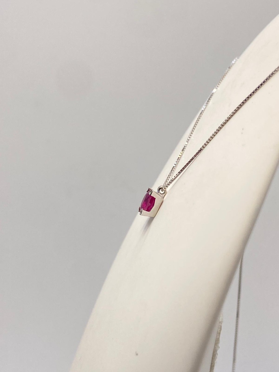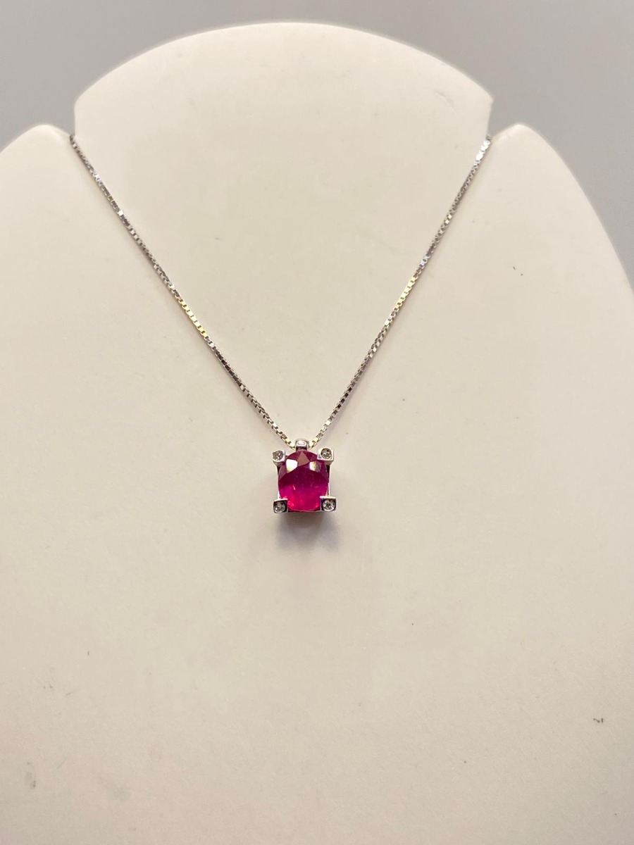 Il ciondolo è realizzato in oro bianco 18kt, metallo pregiato che valorizza la brillantezza del rubino e conferisce alla collana un’eleganza moderna. La montatura a quattro griffes è impreziosita da quattro brillanti dal peso complessivo di 0.03 ct, incastonati sulle punte per esaltare ulteriormente la luminosità della pietra centrale.