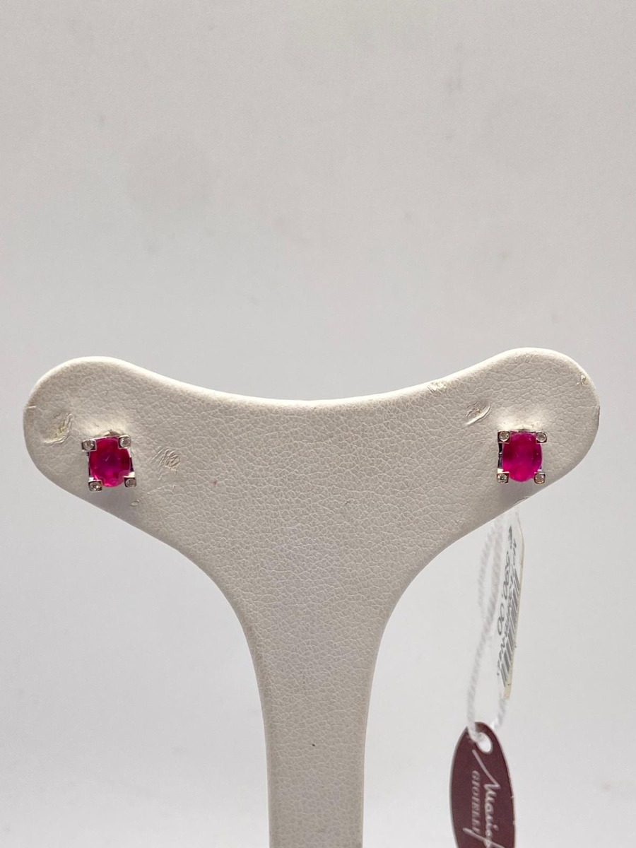 La struttura è realizzata in oro bianco 18kt, metallo nobile che valorizza la lucentezza dei rubini e conferisce agli orecchini un’eleganza pulita e sofisticata. Ogni pietra centrale è racchiusa in una montatura a quattro griffes, le cui estremità sono impreziosite da piccoli diamanti incastonati, per un totale di 0.04 ct complessivi. Questo dettaglio delicato crea un elegante gioco di riflessi che incornicia il rubino e amplifica la luminosità complessiva degli orecchini.