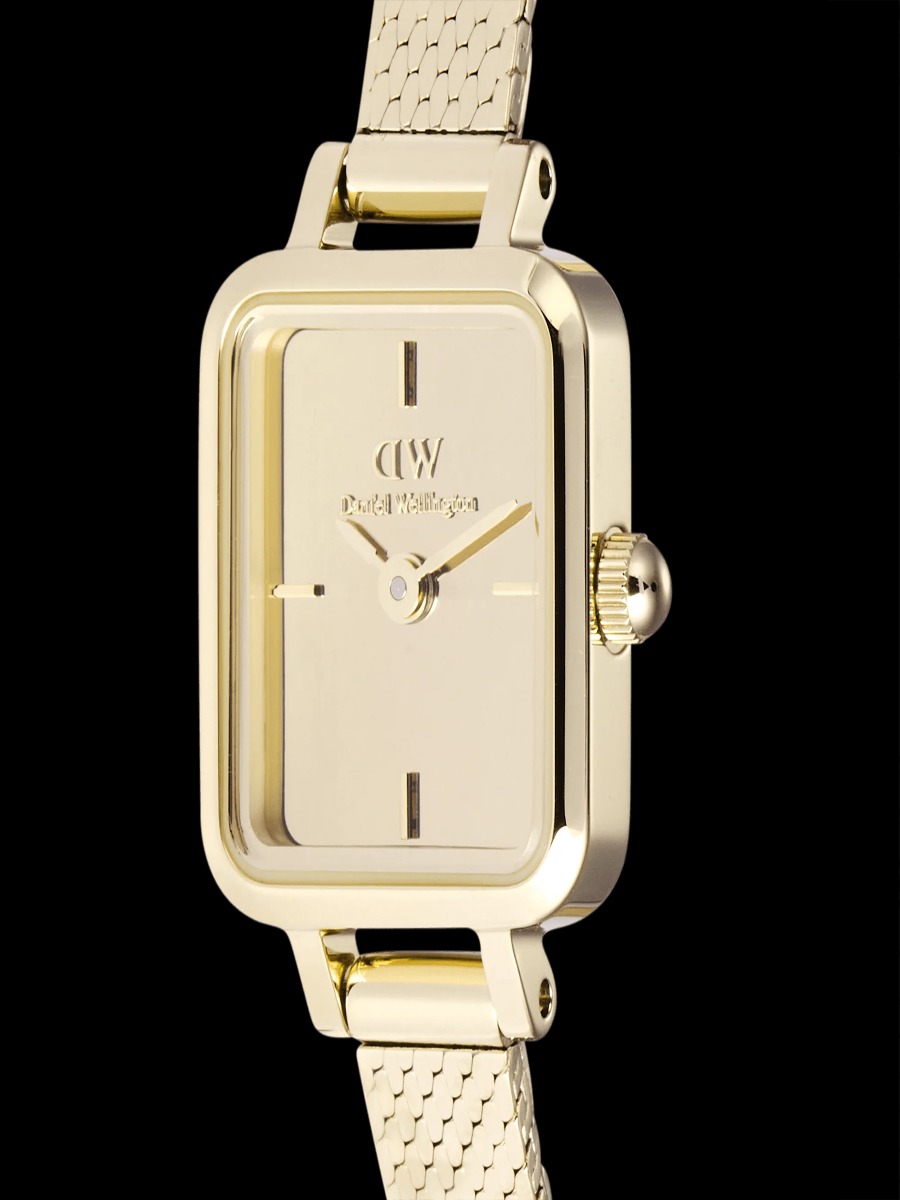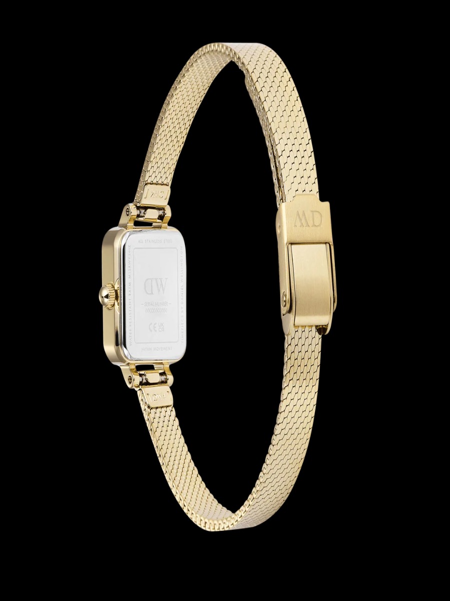 La cassa rettangolare è realizzata in acciaio inossidabile 316L con placcatura PVD color oro, una scelta che garantisce resistenza e luminosità nel tempo. Lo spessore di soli 6 mm offre un profilo sottile e discreto, perfetto per appoggiarsi sul polso con naturalezza. Il cinturino in maglia lucidata color oro completa il design con un effetto fluido e contemporaneo: un richiamo ai gioielli minimal dal gusto urbano. Il risultato è un orologio versatile, capace di accompagnare sia abiti eleganti che outfit più casual.